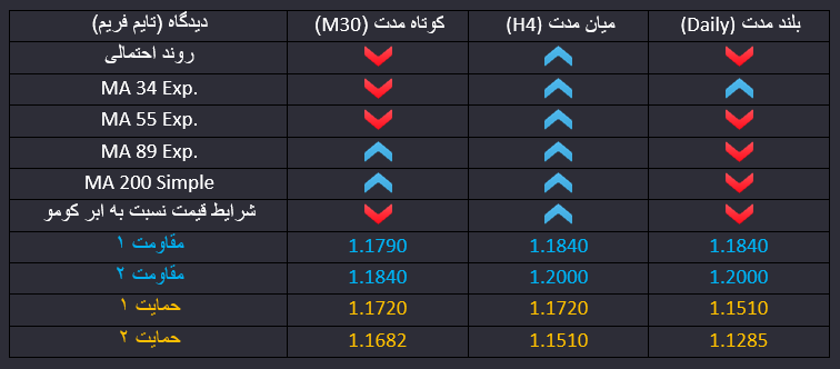 روز گذشته ماریو دراگی رییس بانک مرکزی اروپا بر ادامه سیاست های فعلی پولی این بانک تاکید کرد و امروز نیز شاخص تمایلات اقتصادی آلمان اعلام میگردد که می تواند بر روند کوتاه مدت قیمت تاثیرگذار باشد. قیمت در میان مدت سطح مقاومتی 1.1720 را با اعتبار شکسته و در شرایط پولبک و اصلاح نسبت به این سطح می باشد و احتمال اول در میان مدت ادامه روند صعودی قیمت با پایان پولبک خواهد بود. در کوتاه مدت قیمت به زیر سطوح با اهمیت رفته و احتمال اصلاح و نزول بیشتر در کوتاه مدت وجود دارد. در بلند مدت قیمت در موج صعودی در حرکت است و در حالی مه حمایت 1.1510 را در نزدیکی می بیند به PRZ حاصل از سطح پایین ابر کومو در تایم فریم روزانه، اصلاح فیبو ناچی 23.6 و میانگین میان مدت 55 روزه رسیده و عبور یا برگشت معتبر از این محدوده می تواند نشانه تعیین کننده ای برای ادامه روند قیمت باشد.