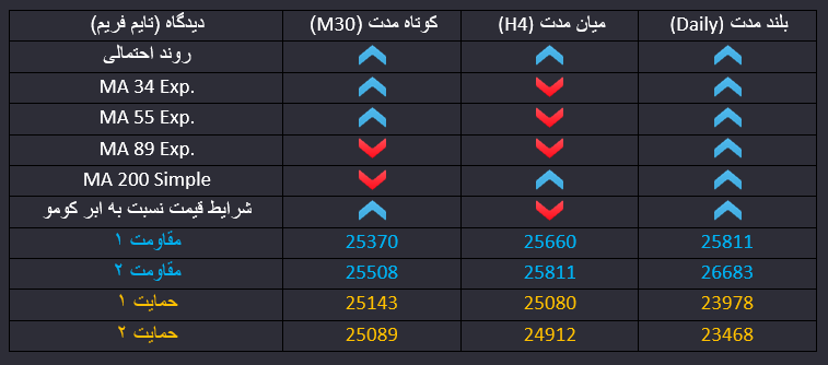 شاخص داوجونز، در حال حاضر شاخص پس از اصلاح میان مدت به محدوده حمایتی حاصل از میانگین 34 روزه در تایم فریم روزانه و میانگین 200 در تایم فریم چهارساعته رسیده است . و نسبت به این محدوده واکنش برگشتی داشته و احتمال پایان اصلاح و بازگشت شاخص به موج صعودی از این محدوده وجود دارد. در کوتاه مدت هم شاخص پس از یک روند نزولی، در حال حاضر به موج صعودی بازگشته و از سطوح میانگین و ابر کومو در تایم فریم سی دقیقه عبور کرده و احتمال اول بازگشت قیمت به موج صعودی است. سطوح مقاومتی 25370 و 25508 در برابر صعود بیشتر قیمت در کوتاه مدت قرار دارند. سطوح حمایتی 25143 و 25089 نیز سطوح حمایتی در برابر نزول قیمت هستند.