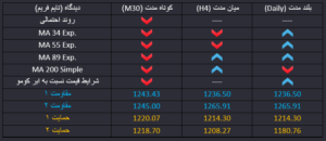 طلا، با افزایش تقاضا برای دلار آمریکا در پی آمار بهتر از پیش بینی ها برای رشد اقتصادی فصلی این کشور، تقاضا برای طلا در برابر دلار کاهش داشته و قیمت نتوانست از محدوده مقاومتی ماژور و با اهمیت 1236.5 دلاری با اعتبار عبور کند و به موج نزولی بازگشته است که می تواند تبدیل به یک اصلاح میان مدت شود. در حال حاضر قیمت در آستانه عبور از سطح پایین چنگال اندروز میان مدت صعودی، ابر کومو و میانگین 89 در تایم فریم چهارساعته قرار دارد که در صورت عبور نزولی معتبر، احتمال اصلاح و نزول میان مدت قیمت افزایش خواهد یافت.
