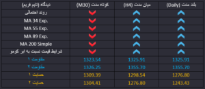 در ادامه روند صعودی بلند مدت قیمت، و پس از آنکه قیمت سطح مقاومت روانی 1300 دلاری را شکسته و به بالاترین سطح در 9 ماه اخیر رسیده است، قیمت نسبت به مقاومت ماژور و نه ماهه 1326 دلاری واکنش برگشتی داشته است و احتمال اصلاح بیشتر قیمت پس از صعود شارپی آن وجود دارد و در کوتاه مدت و میان مدت احتمال نزول بیشتر قیمت طلا وجود دارد ، هرچند همچنان روند بلند مدت صعودی است و احتمال اول برگشت قیمت به موج صعودی با پایان اصلاح قیمتی خواهد بود.