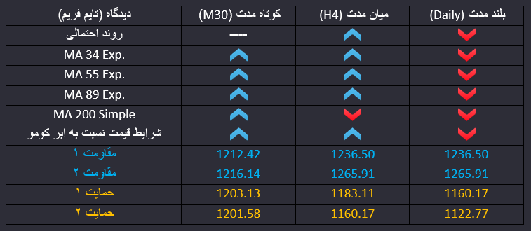 طلا، قیمت پس از نزولی شارپی در چهار ماه گذشته، در شرایط اصلاح قیمتی و زمانی قرار گرفته و در حال حاضر با واکنش به میانگین 34 روزه و میانگین 200 در تایم فریم چهارساعته ، در شرایط رنج و اصلاح زمانی در محدوده 1200 دلاری در حرکت است. قیمت نتوانسته با اعتبار به کانال 1200 دلاری بازگردد و در میان مدت و بلند مدت احتمال اول همچنان ادامه روند نزولی قیمت خواهد بود. در حال حاضر اقبال سرمایه گذاران به سهام، اوراق قرضه و حتی ارزهای دیجیتال افزایش یافته و جایگزین های سرمایه گذاری موجب کاهش تقاضا برای طلا گردیده است. در کوتاه مدت اما قیمت روند خاصی ندارد و در میانه میانگین ها و ابر کومو رنج شده است. هر چند در کوتاه مدت نیز تا حدودی احتمال نزول بیشتر است. سطوح حمایتی 1195.70 و 1183.11 و سطوح مقاومتی 1208.83 و 1214.30 در برابر حرکت های کوتاه مدت قیمت قرار دارند.