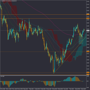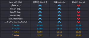 قیمت با رسیده به محدوده برگشتی و PRZ حاصل از خط روند صعودی، میانگین های متحرک و ابر کومو در تایم فریم چهار ساعته، نسبت به آن واکنش برگشتی داشته است و احتمال اول ادامه روند و موج صعودی در میان مدت خواهد بود. سطوح مقاومتی ماژور میان مدت 63.68 و 64.63 در برابر صعود قیمت قرار دارند. ضمن اینکه امروز موجودی ذخایر نفت خام آمریکا اعلام میشود که پیش بینی می شود باز هم برای پنجمین هفته متوالی این ذخایر کاهش یافته باشند که می تواند تقاضا برای نفت را در بازارهای بین المللی افزایش دهد.