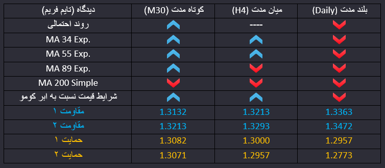 پوند به دلار، در آستانه برگزاری و اعلان نتایج دو نشست با اهمیت فدرال رزرو آمریکا و بانک مرکزی بریتانیا ، قیمت در محدوده مهم میان مدت حاصل از سطح بالای چنگال اندروز نزولی، سطح بالای ابر کومو و میانگین 89 در تایم فریم چهارساعته در نوسان است و قیمت در انتظار خروجی این نشست ها روند مشخصی را دنبال نمیکند . هرچند با توجه به نمودار بلند مدت تمایل قیمت در بلند مدت به نزول بیشتر است. اما احتمال افزایش نرخ بهره بریتانیا در نشست شورای سیاستگذاری پولی بانک مرکزی وجود دارد و در اینصورت تقاضا برای پوند می تواند افزایش داشته باشد و در میان مدت احتمال اصلاح و صعود افزایش خواهد یافت. در کوتاه مدت قیمت سطوح مقاومتی مهمی را شکسته و انتظار می رود در کوتاه مدت شاهد افزایش قیمت تا محدوده 1.3213 باشیم. در صورتی که قیمت تا این محدوده افزایش یابد به معنای عبور قیمت از محدوده های مقاومتی میان مدت نیز می باشد و احتمال صعود قیمت در میان مدت نیز افزایش می یابد.