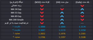 در شرایطی که دولت بریتانیا قصد دارد مجددا مذاکراتی را با اتحادیه اروپا برای موضوع مرزهای ایرلند داشته باشد، تقاضا برای پوند کاهش داشته و قیمت در شرایطی اصلاحی در حرکت است. از نظر تکنیکی قیمت به سطح قیمت روانی 1.3 رسیده و نتوانسته از این محدوده عبور کند و در حال حاضر در شرایط اصلاحی به محدوده برگشتی و PRZ حاصل میانگین 34 روزه، و همینطور ابر کومو، و میانگین میان مدت 55 در تایم فریم چهارساعته رسیده و واکنش قیمت نسبت به این محدوده با اهمیت خواهد بود.