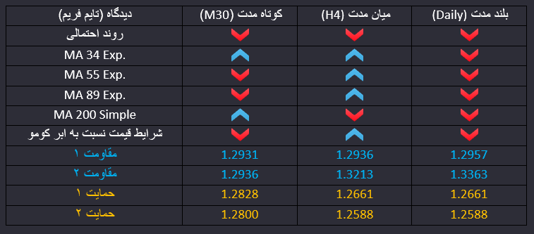 پوند به دلار، روز گذشته آمار بالاتر از انتظاری از شرایط شاخص اطمینان مصرف کننده آمریکا اعلام شد که بهبود شرایط اقتصادی را نشان می داد. امروز هم بازار در انتظار اعلام فصلی رشد اقتصادی یا همان تولید ناخالص داخلی آمریکاست که پیش بینی ها نشان می دهد در محدوده 4 درصدی تثبیت شده است. در مجموع افزایش تقاضا در دلار آمریکا در بازار دیده میشود که می تواند در میان مدت ادامه یابد. از نظر تکنیکی قیمت در میان مدت در حال تشکیل الگوی برگشتی دو قلوی سقف است که در اینصورت احتمال اول ادامه روند نزولی قیمت پس از اصلاح میان مدت در روزهای اخیر خواهد بود. در حال حاضر قیمت به PRZ حاصل از میانگین های میان مدت و ابر کومو در تایم فریم چهارساعته رسیده که عبور از این محدوده می تواند به معنای تمایل قیمت برای نزول بیشتر باشد. در کوتاه مدت هم قیمت روند صعودی را شکسته و احتمال اول نزول به سمت حمایت های 1.2828 و 1.28 است.