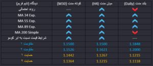 افزایش تقاضا برای یورو در پی حل و فصل تقریبی کسری بودجه ایتالیا و کاهش تقاضا برای دلار پس از افزایش کوتاه مدت اولیه در پی نتایج نشست فدرال رزرو آمریکا ، موجب شده است که قیمت صعودی شارپی داشته باشد و سطوح مقاومتی شامل سطح بالای چنگال اندروز نزولی و مقاومت های 1.1442 و 1.1472 را شکسته و به نزدیکی مقاومت ماژور 1.15 برسد. احتمال اول در میان مدت ادامه روند صعودی است و در کوتاه مدت احتمال اصلاح در محدوده 1.15 وجود دارد.