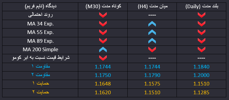 یورو به دلار، امروز آمار ضعیف تر از انتظار از شاخص مدیران خرید آلمان اعلام شد که البته تفاوت زیادی با پیش بینی ها نداشت. در ادامه هم اخبار اشتغال آمریکا و نتایج نشست فدرال رزرو می تواند بر روند قیمت تاثیر گذار باشد. از نقطه نظر تکنیکی قیمت به محدوده مهم مقاومتی 1.1744 دوباره واکنش برگشتی داشته است. این محدوده در دو هفته اخیر چهار بار مانع صعود قیمت بوده است و حالا یک مقاومت ماژور در برابر قیمت محسوب میشود. در حال حاضر روند قیمت همچنان خنثی است و قیمت در یک الگوی مثلث در بالای حمایت 1.1510 رنج شده است و عبور معتبر از سطوح بالا و پایین مثلث می تواند تعیین کننده روند میان مدت و بلند مدت قیمت باشد. در کوتاه مدت اما روند قیمت نزولی است و با توجه به عبور قیمت از سطوح حمایتی، احتمال اول ادامه روند نزولی قیمت تا سطوح 1.1648 و 1.1620 خواهد بود.