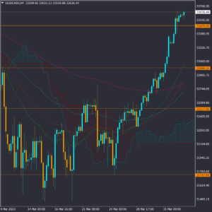 با وجود افزایش قیمت نفت خام و احتمال افزایش تورم، سطح ریسک پذیری در بازار های مالی و سهام تقویت شده است. گزارش های مالی بسیاری از شرکت ها در صنایع مختلف منتشر شده و امیدواری هایی را ایجاد کرده که نشان می دهد احتمال رکود کاهش یافته است و شاخص های داوجوز، نزدک و S&P500 با شکست سطوح مهم مقاومتی در روند صعودی میان مدت در حرکت هستند. از نظر تکنیکالی، شاخص داوجونز محدوده مقاومتی ابر کوموی روزانه را نیز شکسته و با عبور معتبر از مقاومت 33480 واحدی، احتمال افزایش بیشتر این شاخص تقویت شده است. در کوتاه مدت احتمال اصلاح قیمتی و زمانی و پولبک نسبت به مقاومت 33480 واحدی وجود دارد. صعود شارپی قیمت ها در روزهای اخیر، احتمال پولبک را تقویت کرده است.