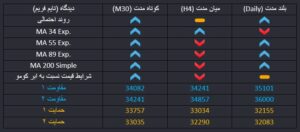 تاکید چند باره توسط اعضای فدرال رزرو آمریکا بر موقتی بودن جهش تورمی و همچنین گمانه زنی ها برای ارائه طرح چند تریلیون دلاری حمایتی و زیرساختی دولت بایدن، موجب افزایش سطح تقاضا در بازار های سهام شده و با افزایش قیمت سهام ها، شاخص داوجونز سطح مقاومتی 34241 واحدی را شکسته و احتمال صعود میان مدت شاخص افزایش یافته است. در کوتاه مدت احتمال اصلاح و پولبک وجود دارد.