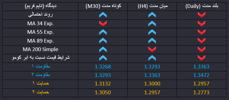 در پوند به دلار، قیمت در ادامه موج صعودی از محدوده مهم مقاومتی حاصل از سطح بالای چنگال اندروز میان مدت نزولی و سطح بالای ابر کومو در تایم فریم چهارساعته عبور کرده و در حال حاضر در شرایط پولبک نسبت به این محدوده قرار دارد. البته سطح مقاومتی میانگین 200 در تایم فریم چهارساعته همچنان در برابر صعود قیمت قرار دارد. در ادامه احتمال اول در میان مدت ادامه روند صعودی قیمت خواهد بود اما در بلند مدت این نوسانات بخشی از موج اصلاحی میان مدت محسوب می گردد و احتمال اول همچنان ادامه روند نزولی با پایان اصلاح میان مدت خواهد بود. قیمت در بلند مدت به میانگین 34 روزه خود رسیده و واکنش قیمت نسبت به این محدوده با اهمیت خواهد بود. در کوتاه مدت قیمت سطوح مقاومتی میانگین و ابر کومو را در تایم فریم 30 دقیقه شکسته و احتمال اول ادامه روند صعودی با پایان اصلاح خواهد بود. سطوح مقاومتی 1.3268 و 1.3293 در برابر صعود بیشتر قیمت قرار دارند.