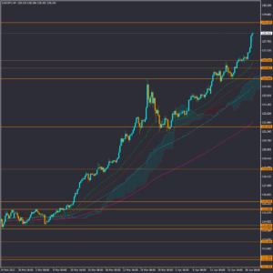 در برابری دلار به ین، قیمت مقاومت ماژور 126.4 را نیز با اعتبار شکسته و به بالاترین سطح در بیست سال اخیر رسیده است و همچنان در میان مدت احتمال اول ادامه روند صعودی است. در حال حاضر قیمت