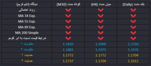 در برابری یورو به دلار، در ادامه روند نزولی، قیمت پس از اصلاح کوتاه مدت، به موج نزولی بازگشته و احتمال اول ادامه روند نزولی در کوتاه مدت و میان مدت خواهد بود. سطح حمایتی 1.1772 در برابر نزول قیمت قرار دارد. امروز اخبار مربوط به شاخص تورمی سالانه قیمت مصرف کننده در اروپا و شاخص خرده فروشی در آمریکا می تواند بر این روند تاثیرگذار باشد.