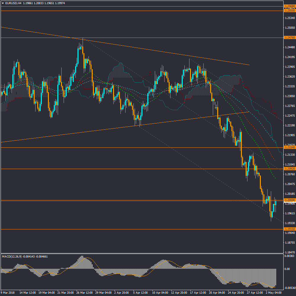 در جفت ارز یورو به دلار، قیمت در میانه روند نزولی در محدوده حمایتی 1.2 و سطح پایین چنگال میان مدت در نوسان است و