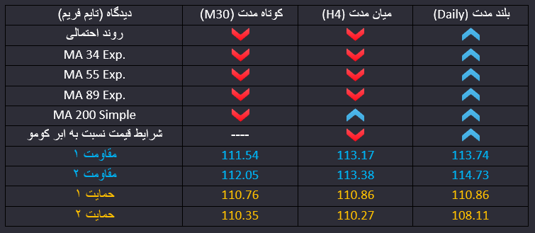 در دلار به ین، در میان مدت قیمت پس از عبور از محدوده های با اهمیت حمایتی در شرایط رنج و اصلاح زمانی قرار دارد و البته دیدار ترامپ و یونکر و ادامه گمانه زنی ها درباره جنگ تجاری می تواند بر روند قیمت تاثیرگذار باشد. افزایش تنش ها در تجارت بین الملل میتواند به افزایش تقاضا برای ین ژاپن بعنوان ارز ایمن تر در بازارهای مالی منجر گردد. در میان مدت احتمال اول ادامه روند نزولی با پایان اصلاح زمانی است. دربلند مدت همچنان روند اصلی بازار صعودی است وحرکت فعلی یک اصلاح میان مدت در قیمت محسوب می گردد. در کوتاه مدت نیز قیمت رنج است و در محدوده میانگین ها و ابر کومو در تایم فریم سی دقیقه در نوسان است و روند خاصی را دنبال نمیکند. اما احتمال بیشتر نزول قیمت تا محدوده حمایتی 110.76 و 110.35 خواهد بود.