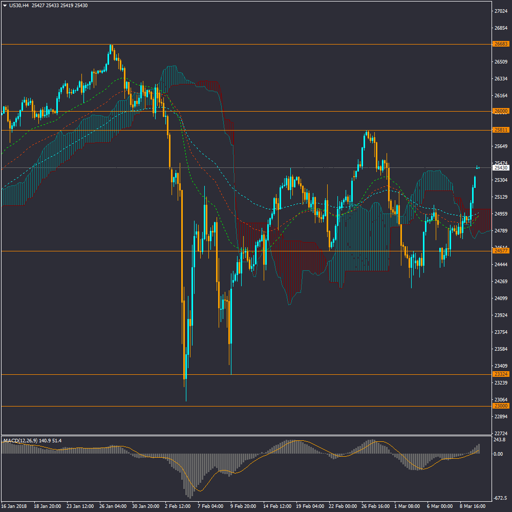 در شاخص داوجونز، با امضای فرمان افزایش تعرفه ها توسط ترامپ و لحن ملایم تر از حد انتظار در این فرمان که کشورهای کانادا و مکزیک و متحدین دیگر را با شرایطی از آن معاف ساخته و واکنش ملایم اروپا به این فرمان و همچنین احتمال دیدار بین ترامپ و رییس جمهور کره شمالی، تقاضا در بازارهای سهام در آمریکا افزایش یافته و شاخص در موج صعودی در حرکت است و احتمال اول در میان مدت ادامه روند صعودی خواهد بود. شاخص سطوح مقاومتی را با اعتبار شکسته است.