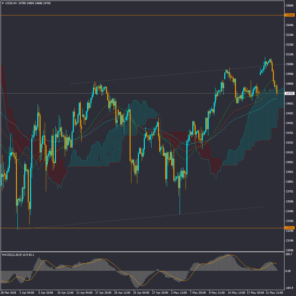 در شاخص داوجونز، توئیت دونالد ترامپ در باره دو موضوع مذاکرات تجاری با چین و دیدار با رهبر کره شمالی بازار های بورس را نیز تحت تاثیر قرار داد و شاخص در شرایط نزولی در حرکت است و در کوتاه مدت و پیش از واکنش های دوباره از سوی طرفین احتمال نزول بیشتر شاخص وجود دارد، اما این شرایط در ادامه تحت تاثیر اخبار و گمانه زنی های تکمیلی خواهد بود.