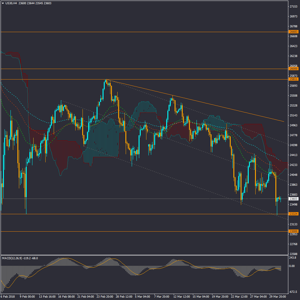 در شاخص داوجونز، چند موضوع با اهمیت موجب کاهش تقاضا و شاخص بورس گردیده است، که از مهمترین علل اعلام برنامه چین برای اعمال تعرفه های وارداتی بر محصولات آمریکایی، کاهش قیمت سهام آمازون در پی توئیت دونالد ترامپ بر ضد این شرکت ، کاهش قیمت سهام اینتل و کاهش ریسک پذیری در بازار بوده است. در ادامه شاخص به حمایت 23320 واحدی واکنش اصلاحی داشته است، ولی در میان مدت احتمال اول همچنان نزول بیشتر شاخص خواهد بود.