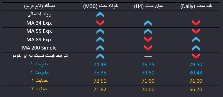 در نفت خام برنت، امروز ساعت 19 بوقت تهران تغییرات موجودی ذخایر نفت خام آمریکا اعلام میگردد که پیش بینی کارشناسان کاهش در این ذخایر است، که می تواند تقاضا برای نفت را افزایش دهد. در حال حاضر با افزایش نگرانی ها از کاهش صادرات نفت ونزوئلا و همین طور تحریم های ایران، قیمت در میان مدت به موج صعودی بازگشته و احتمال اول در میان مدت صعود بیشتر قیمت است. در بلند مدت اما قیمت در ادامه موج صعودی به سطح پایین ابر کومو در تایم فریم روزانه و میانگین 89 روزه خود رسیده و عبور معتبر از این محدوده احتمال صعود بیشتر را افزایش خواهد داد. در کوتاه مدت نیز قیمت سطوح مقاومتی میانگین های متحرک و ابر کومو در تایم فریم سی دقیقه را شکسته و احتمال صعود قیمت تا مقاومت های 74.48 و 75.35 افزایش یافته است.