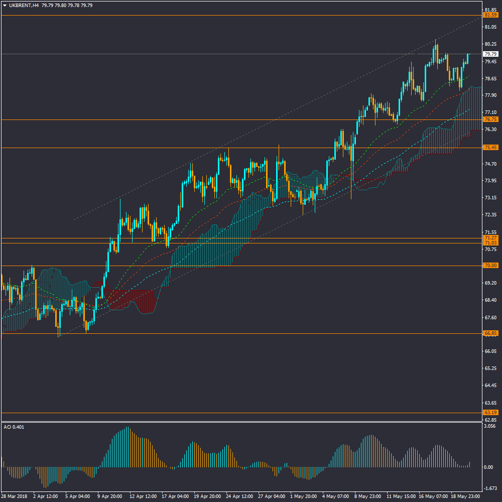 در نمودار نفت خام برنت، قیمت با رسیدن به محدوده برگشتی حاصل از ابر کومو و میانگین میان مدت 55 در تایم فریم چهارساعته با پایان اصلاح کوتاه مدت به موج صعودی بازگشته و احتمال اول در کوتاه مدت و میان مدت ادامه روند صعودی قیمت خواهد بود. اظهارات وزیر امروز خارجه آمریکا در مورد تحریم های ایران و تاکید بر آنکه سخت ترین تحریم های اقتصادی آمریکا بر علیه کشوری تا کنون خواهد بود، تقاضا را در بازارهای نفت افزایش داده است. ضمن اینکه با پیروزی مجدد مادورو در انتخابات ونزوئلا تحریم های آمریکا بر علیه این کشور نیز ادامه خواهند یافت که این نکته نیز در تقاضای بازار موثر بوده است.