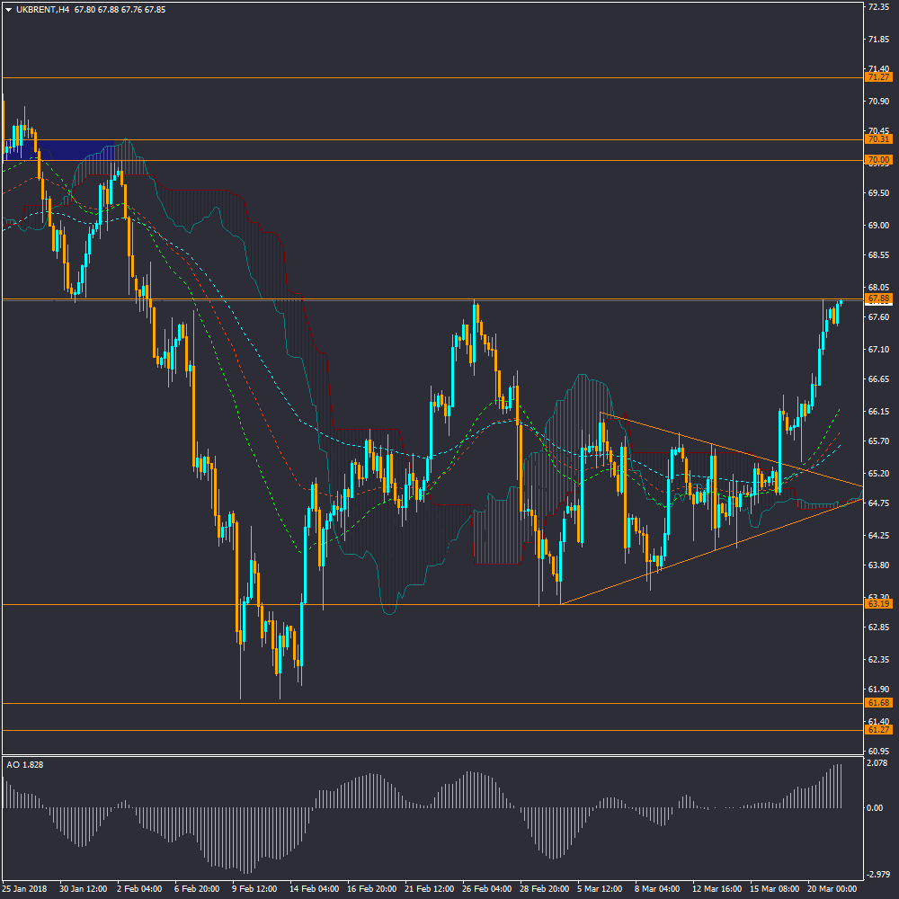 در نمودار نفت خام برنت، قیمت در ادامه روند صعودی به مقاومت ماژور 67.88 رسیده است و واکنش قیمت نسبت به این محدوده با اهمیت خواهد بود