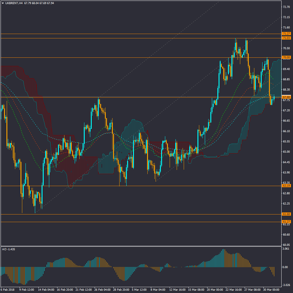 در نمودار نفت خام برنت، کاهش تقاضای بین المللی نفت در واکنش به تنش های بین المللی بر سر تعرفه های اعمالی آمریکا و چین بر ضد یکدیگر و اخبار مرتبط با افزایش تولید روسیه ، موجب کاهش قیمت نفت در بازار گردیده است . قیمت سطح پایین چنگال اندروز میان مدت صعودی را شکسته و به سطح پایین ابر کومو در تایم فریم چهارساعته رسیده است که عبور معتبر از این محدوده احتمال نزول میان مدت قیمت را تقویت خواهد کرد. در کوتاه مدت اما قیمت به این محدوده واکنش برگشتی و صعودی داشته است که احتمال اول ادامه روند نزولی قیمت با پایان اصلاح کوتاه مدت در این محدوده خواهد بود.