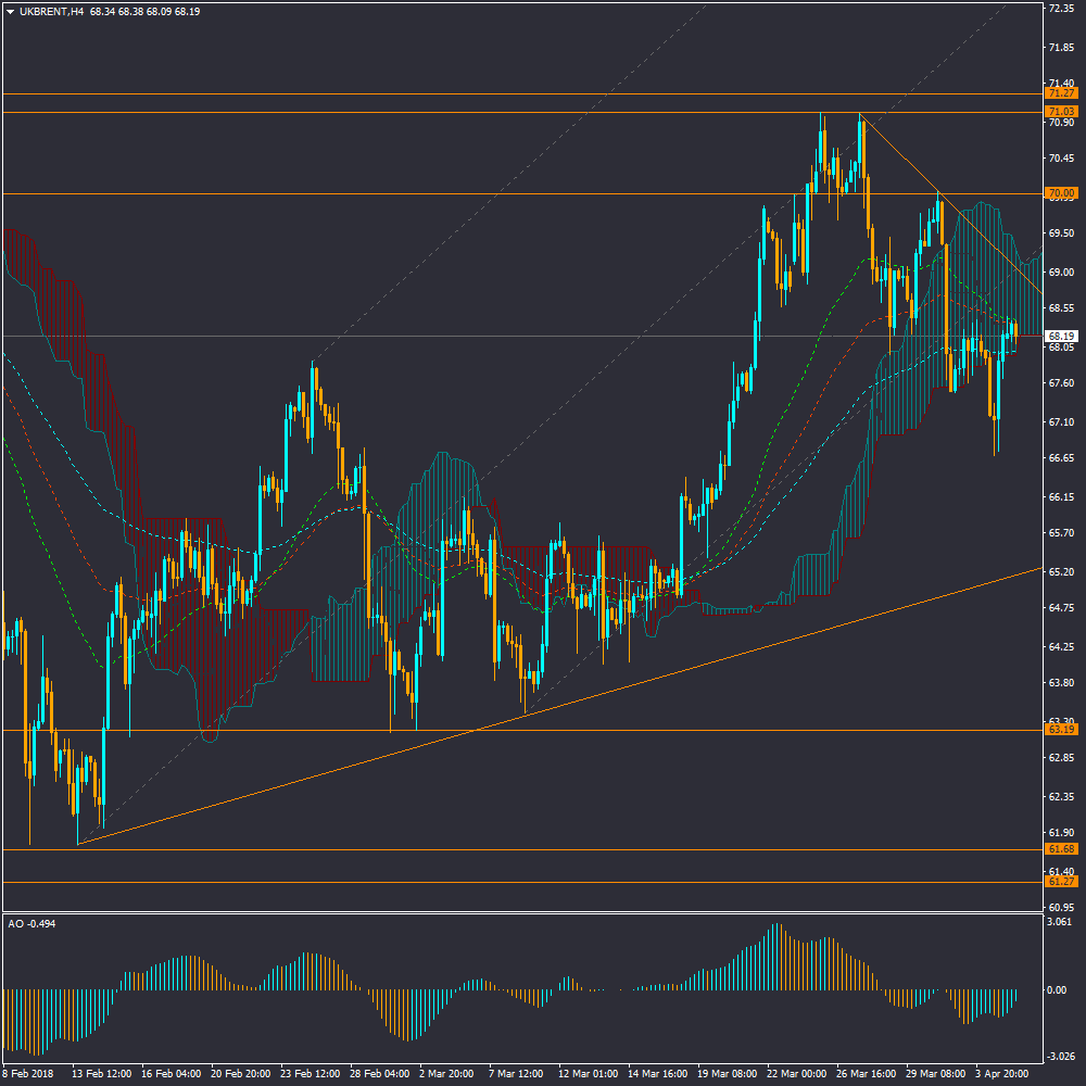 در نمودار نفت خام برنت، کاهش تنش های بین المللی و بازگشت تقاضا به بازارهای بورس بین المللی تقاضا برای نفت را نیز افزایش داده و البته موجودی ذخایر نفت خام آمریکا نیز چهارمیلیون و ششصد هزار بشکه نسبت به هفته گذشته کاهش داشته است که دلیل دیگری برای افزایش تقاضا در بازار بوده است. با این وجود روند میان مدت قیمت همچنان نزولی است و واکنش قیمت نسبت به خط روند نزولی میان مدت و سطح پایین ابر کومو در تایم فریم چهار ساعته تعیین کننده خواهد بود.