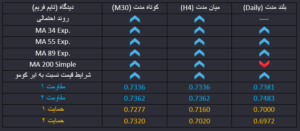 دلار استرالیا به دلار، با کاهش تقاضا برای دلار آمریکا، قیمت صعودی شارپی داشته استو در حال حاضر به محدوده مقاومتی ماژور 0.7335 رسیده و واکنش قیمت نسبت به این محدوده تعیین کننده است. احتمال اول در کوتاه مدت اصلاح و برگشت در این محدوده است اما در میان مدت احتمال اول همچنان ادامه روند صعودی خواهد بود. اخبار تورمی امروز از بازار آمریکا نیز می تواند بر این روند تاثیرگذار باشد.