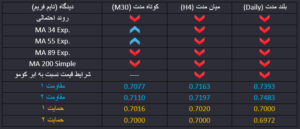 در ادامه روند نزولی قیمت به محدوده حمایتی ماژور 0.7 تا 0.7020 رسیده و نتوانسته از این محدوده عبور کند و نسبت به آن واکنش اصلاحی و برگشتی داشته است که در کوتاه مدت احتمال ادامه این اصلاح وجود دارد اما در میان مدت همچنان احتمال اول ادامه روند نزولی با پایان اصلاح خواهد بود. همچنان این محدوده PRZ در برابر قیمت است و واکنش قیمت نسبت به آن تعیین کننده است.