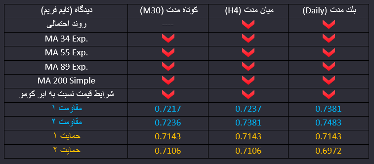 دلار استرالیا به دلار ، آمار بامداد امروز از رشد اقتصادی استرالیا بهتر از انتظار ها بود و به طور موقت تقاضا برای دلار استرالیا را افزایش داد، اما پس از آن قیمت دوباره به روند نزولی بازگشته و در حال حاضر به حمایت تاریخی و کمترین میزان برابری در دو سال و نیم اخیر رسیده و واکنش قیمت نسبت به این سطح قیمتی تعیین کننده خواهد بود. احتمال اول ادامه روند نزولی و عبور قیمت از این سطح ماژور پس از اصلاح کوتاه مدت خواهد بود. بامداد فردا هم شاخص تراز تجاری استرالیا اعلام میشود و البته فردا و جمعه آمار های مهمی از شرایط اشتغال و بیکاری آمریکا اعلام میشود که مجموعا می توانند بر روند قیمت تاثیرگذار باشند.