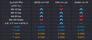 دلار استرالیا به دلار ، در ادامه اصلاح و نزول قیمت در پی افزایش تقاضا برای دلار آمریکا، قیمت به محدوده حمایت ماژور تغییر قطب یافته 0.7160 رسیده و نسبت به آن واکنش برگشتی داشته است. از نظر تکنیکی قیمت در بلند مدت نتوانسته روند صعودی خود را تثبیت کند و  در واکنش به سطح بالای ابر کومو و مقاومت ماژور 0.73 واکنش برگشتی داشته است به همین دلیل نمی توان موج صعودی فعلی را بعنوان شروع یک موج میان مدت صعودی قلمداد کرد و احتمال دارد که این برگشت نزول آغاز یک روند میان مدت نزولی باشد. بهمین دلیل در حال حاضر روند میان مدت قیمت نا مشخص است و نیاز است که واکنش های قیمت به سطوح ماژور بازار مورد بررسی قرار گیرد.
