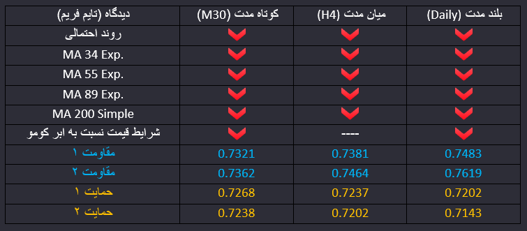 دلار استرالیا به دلار آمریکا، گزارش ضعیف از شرایط سرمایه گذاری بخش خصوصی در استرالیا، تقاضا برای برای دلار این کشور را باز هم کاهش داده و قیمت سطح پایین چنگال نزولی را شکسته و احتمال اول در میان مدت ادامه روند نزولی قیمت تا محدوده های حمایتی و کف های تاریخی 0.7237 و 0.72 خواهد بود. در کوتاه مدت قیمت در روند اصلاحی صعودی در حرکت است اما احتمال اول در کوتاه مدت نیز بازگشت قیمت به موج نزولی است. سطوح حمایتی 0.7268 و 0.7238 در برابر نزول قیمت در کوتاه مدت قرار دارند.