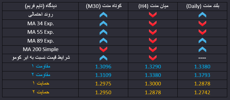 دلار به دلار کانادا، اخبار و گمانه زنی ها نشان می دهد که آمریکا، کانادا و مکزیک به توافق برای تمدید پیمان نفتا نزدیک شده اند و در اینصورت تقاضا برای دلار کانادا باز هم میتواند افزایش یابد. اما در ادامه روند نزولی قیمت همچنان نتوانسته از محدوده 1.3 با اعتبار بگذرد و افزایش فرصت های شغلی در آمریکا موجب اصلاح قیمتی در این محدوده شده است. احتمال اول اما در میان مدت عبور قیمت از این محدوده و ادامه روند نزولی میان مدت و اصلاحی در بلند مدت است. در بلند مدت قیمت به یک محدوده مهم تعیین کننده رسیده که حاصل خط روند صعودی بلند مدت، سطح پایین ابر کومو و میانگین 89 روزه است که در صورت برگشت معتبر می تواند احتمال برگشت قیمت به موج صعودی پس از یک اصلاح میان مدت در ماه اخیر را افزایش دهد و البته در روز دیگر سکه در صورتیکه این محدوده با اعتبار شکسته شود احتمالا روند بلند مدت قیمت نیز تغییر می یابد. پس توجه معامله گران به واکنش معتبر قیمت در این محدوده لب شمشیری است. در کوتاه مدت قیمت سطوح مقاومتی میانگین و ابر کومو را در تایم فریم سی دقیقه شکسته و احتمال اول ادامه حرکت صعودی تا محدوده 1.31 خواهد بود.