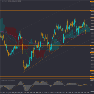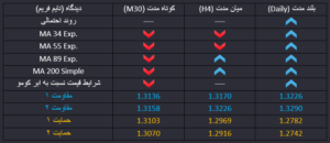 دلار به دلار کانادا، قیمت نتوانسته از محدوده حمایتی مهم حاصل از خط روند صعودی ، ابر کومو در تایم فریم های روزانمه و چهارساعته ، میانگین های میان مدت روزانه و میانگین 200 در تایم فریم چهارساعته عبور نماید و در این محدوده رنج شده است و واکنش قیمت نسبت به این محدوده تعیین کننده است. از نظر تکنیکی بدلیل اینکه قیمت در یک روند میان مدت صعودی در حرکت است، احتمال صعود میان مدت با پایان اصلاح بیشتر است اما در صورتی که قیمت از این محدوده مهم با اعتبار عبور کند، روند میان مدت قیمت تغییر یافته و احتمال نزول میان مدت افزایش می یابد.