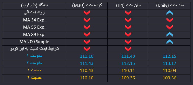 دلار به ین، مجموعه اخبار از شورای سیاست گذاری پولی بانک مرکزی ژاپن نشان می دهد که این شورا احتمال پیش از رسیدن تورم به هدف دو درصدی مبادرت به افزایش نرخ بهره و کاهش سیاست های تسهیل پولی خواهد کرد و این موضوع تقاضا برای ین را افزایش داده است و در حال که قیمت به موج صعودی بازگشته بود، حالا در شرایط رنج در بالای حمایت 110.11 در حرکت است و احتمال نزول بیشتر قیمت در میان مدت افزایش یافته است. در کوتاه مدت هم قیمت در میانه میانگین ها و ابر کومو در تایم فریم 30 دقیقه رنج شده و روند مشخصی ندارد. احتمال اول بازگشت قیمت به موج نزولی است.