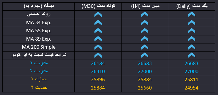 شاخص داوجونز، با پایان پولبک و اصلاح ، شاخص نسبته به محدوده برگشتی میان مدت حاصل از حمایتی تغییر قطب یافته 25884 ، ابر کومو و میانگین 55 در تایم فریم چهارساعته واکنش برگشتی داشته و به موج صعودی بازگشته و احتمال اول ادامه روند صعودی شاخص در میان مدت و بلند مدت خواهد بود.و در کوتاه مدت نیز شاخص روندی صعودی دارد و سطوح ماژور مقاومتی در برابر آن در محدوده های 26184 و 26310 قرار دارند.