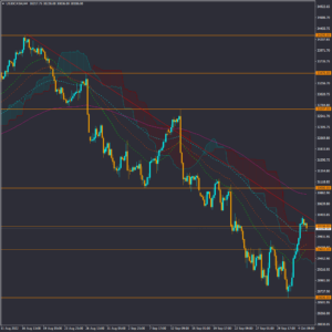 در برابری یورو به دلار، قیمت در یک صعود اصلاحی شارپی به PRZ حاصل از سطح روانی و با اهمیت برابری یورو و دلار و خط روند نزولی میان مدت رسیده و نسبت به آن واکنش اصلاحی و برگشتی داشته است. در کوتاه مدت احتمال اول ادامه اصلاحی و نزول خواهد بود.