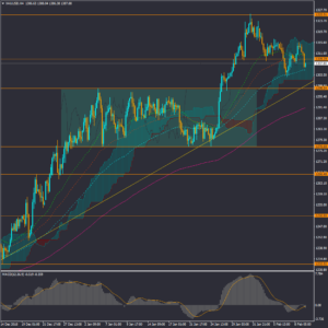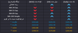 قیمت در شرایط اصلاح میان مدت و نزولی قرار گرفته و تقاضا برای طلا کاهش داشته است. این موج حرکتی میتواند پولبک میان مدت به سطح ماژور 1300 دلاری باشد و واکنش قیمت نسبت به محدوده 1300 دلاری در تایم فریم روزانه تعیین کننده است. در همین محدوده خط روند میان مدت صعودی قیمت و ابر کوموی تایم فریم چهارساعته تشکیل PRZ داده اند و اهمیت محدوده 1300 دلاری افزایش یافته است.