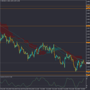 در جفت ارز پوند به دلار، قیمت در میانه روند میان مدت نزولی ، در شرایط اصلاحی در حرکت است و در حال حاضر به محدوده حط روند نزولی و میانگین های میان مدت و ابر کومو در تایم فریم چهارساعته رسیده و واکنش قیمت به این محدوده در میان مدت تعیین کننده است. در کوتاه مدت قیمت نسبت به این محدوده واکنش داشته و احتمال اول نزول بیشتر قیمت در این محدوده خواهد بود. در میان مدت نیز احتمال اول ادامه موج نزولی قیمت تا سطح 1.3 می باشد.