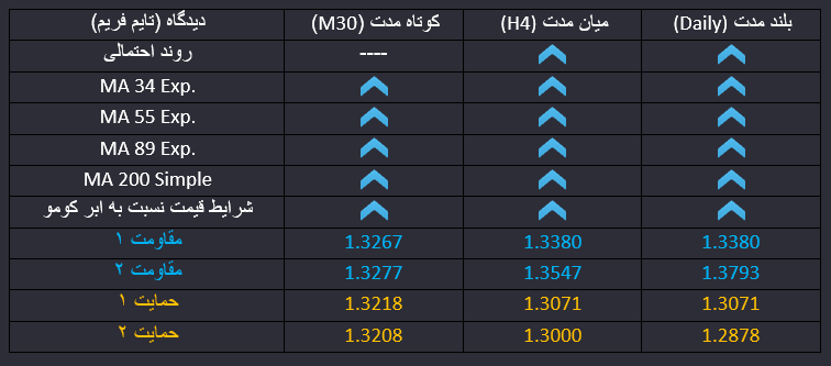 قیمت نسبت به سطوح برگشتی با اهمیتی در میان مدت واکنش برگشتی داشته است و به موج صعودی میان مدت و بلند مدت بازگشته است ، سه سطح با اهمیت خط روند صعودی میان مدت، سطح پایینی ابر کومو و میانگین 200 در تایم فریم چهارساعته تشکیل یک PRZ داده بودند. در بلند مدت نیز قیمت به PRZ حاصل اصلاح 23.6 فیبوناچی موج ماژور قبلی و میانگین 34 روزه رسیده و نسبت به آن واکنش برگشتی داشته است. در هر دو تایم فریم میان مدت و بلند مدت احتمال اول ادامه روند صعودی خواهد بود. مقاومت ماژور 1.3380 در برابر صعود بیشتر قیمت قرار دارد. در کوتاه مدت قیمت با یک موج شارپی صعودی سطوح مقاومتی متعددی را شکسته و احتمال اصلاح قیمتی و پولبک نسبت به این سطوح در کوتاه مدت وجود دارد اما احتمال اول ادامه صعود پس از پایان پولبک و اصلاح خواهد بود.