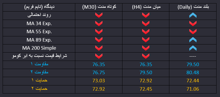 روز گذشته روز پر خبری از بازار نفت بود که در مجموع برآیند این اخبار ریزش شدید قیمت نفت در بازارهای بین المللی بود. در ابتدا و در آستانه دیدار ترامپ و سران ناتو اخبار و گمانه زنی هایی منتشر شد، مبنی بر آنکه امکان دارد آمریکا با برخی از واردکنندگان نفت ایران برای معافیت از تحریم ها مذاکره نماید. این خبر موجب کاهش قیمت نفت گردید و در همین حال لیبی هم اعلام کرد که چهار ترمینال نفتی خود را بازگشایی خواهد کرد و در سایه این دو خبر کاهش 12 میلیون بشکه ای ذخایر نفت آمریکا نتوانست موجب افزایش تقاضا گردد و قیمت به محدوده 73 دلار برای هر بشکه سقوط کرد. در حال حاضر قیمت در شرایط اصلاح حرکت هیجانی روز گذشت در حرکت است اما همچنان در میان مدت و کوتاه مدت احتمال نزول بیشتر قیمت با پایان اصلاح وجود دارد. در میان مدت قیمت الگوی برگشتی دوقلوی سقف تشکیل داده است اما تا همین جا هم هدف های اولیه الگو توسط قیمت دیده شده است. در بلند مدت قیمت همچنان در کانال صعودی در حرکت است و حرکت اخیر بخشی از موج اصلاحی قیمت است و احتمال اول همچنان بازگشت قیمت به موج بلند مدت صعودی با پایان اصلاح است