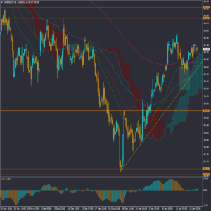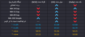 دیروز موجودی ذخایر نفت خام آمریکا اعلام شد که با کاهش دو میلیون و ششصد هزار بشکه ای را نشان می داد که می تواند تاییدی بر روند صعودی فعلی قیمت نفت در بازارهای بین المللی باشد. ضمن اینکه قیمت با رسیده به محدوده برگشتی و PRZ حاصل از خط روند صعودی، میانگین های متحرک و ابر کومو در تایم فریم چهار ساعته، نسبت به آن واکنش برگشتی داشته است و احتمال اول ادامه روند و موج صعودی در میان مدت خواهد بود. سطوح مقاومتی ماژور میان مدت 63.68 و 64.63 در برابر صعود قیمت قرار دارند. در کوتاه مدت قیمت در شرایط اصلاح زمانی و رنج در حرکت است و احتمال ادامه حرکت رنج قیمت در کوتاه مدت وجود دارد.