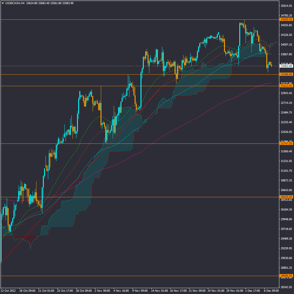 نگرانی فعالین اقتصادی از رکود اقتصادی موجب کاهش سطح ریسک پذیری در بازار های مالی و سهام شده است و شاخص های سهام در آمریکا در شرایط اصلاح و نزول در حرکت هستند. از نظر تکنیکالی، شاخص داوجونز از میانگین های میان مدت در تایم فریم چهارساعته به پایین عبور کرده، و احتمال نزول کوتاه مدت شاخص تقویت شده است. میانگین مهم 34 روزه در برابر نزول بیشتر شاخص قرار دارد و واکنش به این محدوده در اعداد 33100 تا 33200 واحدی تعیین کننده خواهد بود.