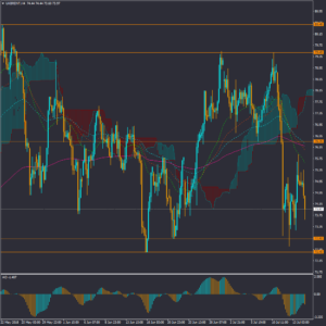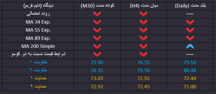 پس از یک اصلاح قیمتی بر روی نزول هیجانی در هفته گذشته، دوباره قیمت نفت به موج نزولی میان مدت بازگشته و احتمال اول ادامه نزول تا حمایت ماژور 72.45 خواهد بود. این محدوده کمترین قیمت نفت در سه ماه اخیر است و در میان مدت بعنوان کف و حمایت ماژور محسوب میگردد و واکنش قیمت نسبت به این سطح تعیین کننده است. در بلند مدت قیمت در ادامه اصلاح روند صعودی به محدوده PRZ حاصل از ابر کومو و میانگین میان مدت 89 روزه رسیده و در صورت عبور معتبر از این محدوده احتمال تغییر روند قیمت در بلند مدت وجود دارد. در کوتاه مدت قیمت سطوح حمایتی با اهمیتی را شکسته و احتمال اول ادامه نزول تا محدوده 73 دلاری خواهد بود. در این محدوده سه پیووت ماژور کوتاه مدت در روزهای اخیر تشکیل شده و واکنش قیمت نسبت به محدوده 73 دلاری با اهمیت است.