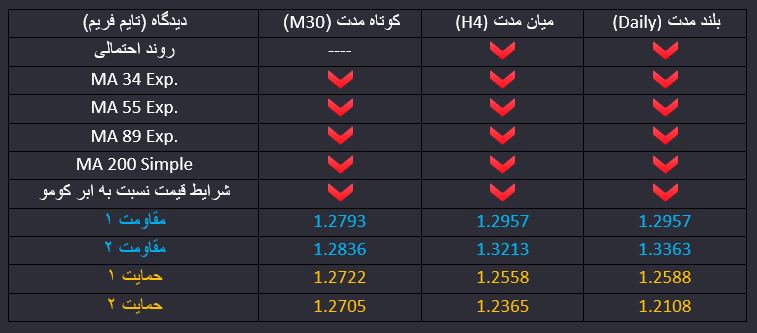 پوند به دلار، در حالی که اعلام افزایش شاخص تورمی قیمت مصرف کننده آمریکا در روز جمعه موجب افزایش تقاضا برای دلار گردید، قیمت در آستانه عبور از حمایت ماژور 1.2773 قرار گرفته و در این محدوده در شرایط اصلاح زمانی رنح شده است. با توجه به شارپی بودن روند نزولی در میان مدت ، انتظار اصلاح زمانی و قیمتی در این محدوده وجود داشت و در کوتاه مدت احتمال اول ادامه اصلاح زمانی و قیمتی خواهد بود. سطوح حمایتی 1.2722 و 1.2705 در برابر نزول قیمت قرار دارند و سطوح مقاومتی 1.2793 و 1.2838 در برابر اصلاح و صعود کوتاه مدت قیمت قرار دارند. در میان مدت همچنان احتمال اول ادامه روند نزولی قیمت با پایان اصلاح خواهد بود. در صورت عبور معتبر قیمت از حمایت 1.2773، سطح حمایتی ماژور بعدی در محدوده 1.2588 خواهد بود.