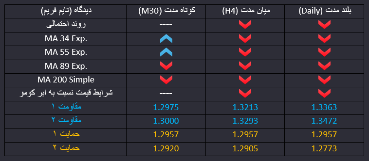 پوند به دلار، در واکنش به گمانه زنی ها و اخبار از احتمال بیشتر برای خروج سخت بریتانیا از اتحادیه اروپا به معنای خروج بدون توافق، روز گذشته تقاضا برای پوند کاهش داشت و قیمت سطح حمایتی 1.3 و 1.2957 را شکست. در حال حاضر قیمت در شرایط اصلاحی در حرکت است و در کوتاه مدت احتمال اصلاح و صعود بیشتر قیمت وجود دارد اما در میان مدت و بلند مدت احتمال اول ادامه روند نزولی قیمت با پایان اصلاح خواهد بود. در کوتاه مدت سطوح مقاومتی 1.2975 و 1.3 در برابر صعود و اصلاح بیشتر قیمت قرار دارند.