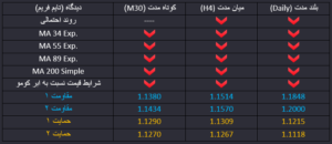 در ادامه روند نزولی قیمت به محدوده حمایتی 1.1310 و 1.1267 رسیده و واکنش قیمت نسبت به این محدوده با اهمیت است. احتمال اصلاح کوتاه مدت قیمت در این محدوده وجود دارد.در میان مدت احتمال اول ادامه روند نزولی قیمت خواهد بود. قیمت در نزدیکی کف تاریخی 1.1215 قرار دارد که از 19 ماه پیش قیمت در بالای این محدوده در حرکت است و واکنش قیمت نسبت به این محدوده تعیین کننده خواهد بود.