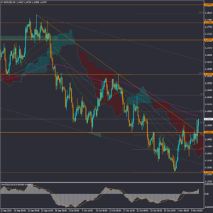 یورو به دلار، کاهش تقاضا برای دلار در پی پیروزی دموکرات ها در کنگره، موجب شد که قیمت از پی ار زد مهم مقاومتی حاصل از خط روند نزولی میان مدت و ابر کومو در تایم فریم چهارساعته عبور کند و در حال حاضر روند قیمت به صعودی تغییر یافته و احتمال اول در میان مدت ادامه این روند صعودی خواهد بود. از طرفی تورم سمت تولید کننده در اروپا رشد محسوسی داشته که این موضوع نیز تقاضا برای یورو را افزایش داده است . .
