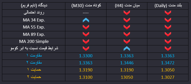 روز گذشته قیمت از سطوح با اهمیتی در تایم فریم میان مدت عبور کرده و احتمال پایان موج صعودی میان مدت افزایش یافته است. قیمت سطح پایین چنگال صعودی میان مدت و میانگین های میان مدت تایم فیرم چهارساعته را شکسته و در حال حاضر ابر کومو در این تایم فریم را در برابر خود می بیند. در صورت عبور معتبر قیمت از سطح 1.3190 احتمال نزول قیمت در میان مدت افزایش خواهد یافت.در بلند مدت قیمت در یک روند نزولی و در شرایط اصلاحی در حرکت است. در حال حاضر قیمت به سطح اصلاح فیبوناچی 23.6 و میانگین 34 روزه در محدوده قیمت 1.3365 رسیده و نسبت به آن واکنش برگشتی داشته است و احتمال اول در بلند مدت ادامه موج نزولی خواهد بود. در کوتاه مدت اما شرایط متفاوت است و قیمت به یک سطح حمایتی ماژور در تایم کوتاه مدت و تایم فریم 30 دقیقه رسیده است. حمایت 1.3190 در برابر نزول بیشتر قیمت قرار دارد و واکنش قیمت نسبت به این سطح تعیین کننده است. در حال حاضر قیمت از روی این حمایت برگشته است و احتمال اصلاح و صعود بیشتر در کوتاه مدت وجود دارد.