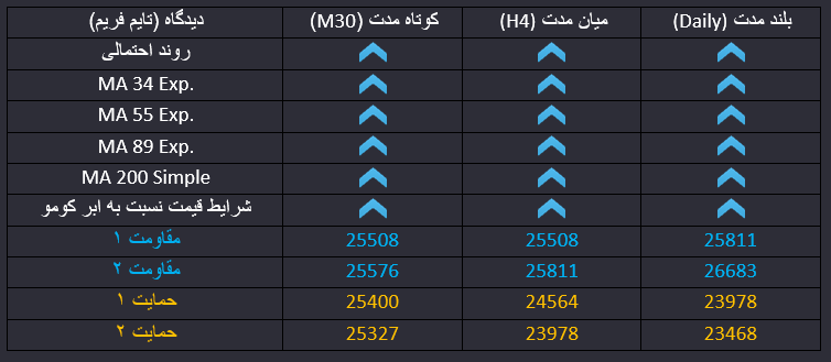 در شاخص داوجونز، با وجود آنکه سهام شرکت فیسبوک شب گذشته در پی پیش بینی کاهش درآمد ها با ریزشی تاریخی و بیش از 23 درصدی سهامدارانش را شوکه کرد، اما با توجه به اینکه فیسبوک در سبد شاخص داوجونز30 قرار ندارد تاثیری بر این شاخص نداشت و در ادامه اعلام مثبت دیگر شرکت ها از تراز های مالی، شاخص داوجونز با هم روندی صعودی داشت و در آستانه عبور معتبر از دو مقاومت ماژور 25400 و 25508 قرار دارد. در بیش از 4 ماه اخیر شاخص در زیر این محدوده در نوسان بوده است. در میان مدت و بلند مدت عبور قیمت از این محدوده مقاومتی به معنای افزایش احتمال صعود خواهد بود. در کوتاه مدت نیز قیمت پس از یک موج شارپی صعودی در شرایط اصلاح زمانی قرار دارد و احتمال اول ادامه روند صعودی کوتاه مدت تا سطح 25508 است.