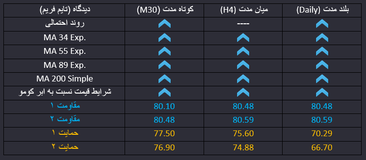نفت خام برنت، در پی اظهارات مقامات عربستان صعودی درباره آینده قیمت نفت و اینکه قیمت های بالای نفت برایشان مناسب است، قیمت نفت در شرایطی که در زیر قیمت 80 دلاری در شرایط اصلاح زمانی در نوسان بود ، بصورت شارپی افزایش یافته و به نزدیکی سطح 79 دلار برای هر بشکه رسیده است.  با توجه به اینکه سطح 79 و 80 دلار سطوح ماژور مقاومتی هستند برای عبور از این سطوح نیاز به افزایش تقاضا قابل توجه در بازار یا کاهش عرضه است که در حال حاضر احتمال کاهش عرضه بدلیل برنامه های تحریمی ایران وجود دارد. بطور کلی واکنش قیمت نسبت به سطوح مقاومتی 79.5 ، 80 و 81.60 دلاری برای هر بشکه در روند قیمت در میان مدت و بلند مدت تعیین کننده است. در کوتاه مدت اما انتظار صعود بیشتر قیمت تا این سطوح وجود دارد.